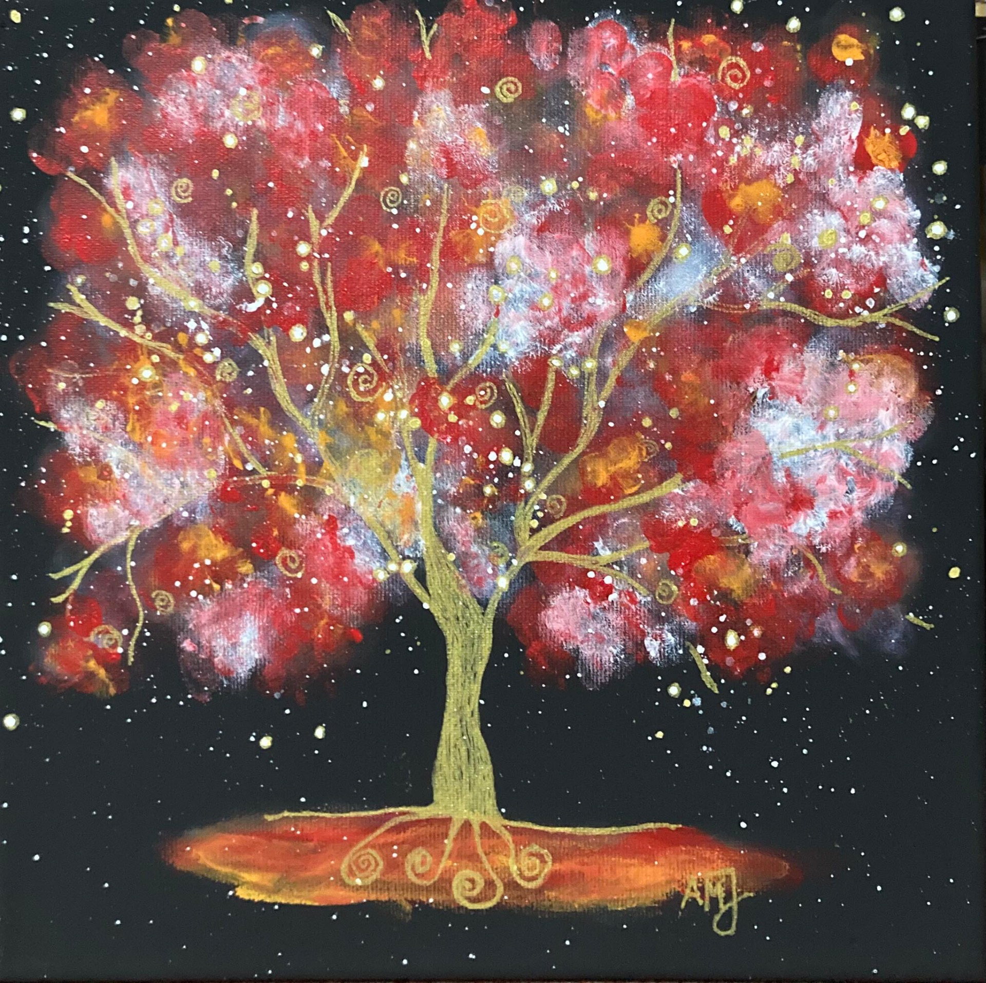 "Kosmiska trädet" akrylmålning 30x30 cm är den första målningen här i min vinterateljè på Gran canaria.